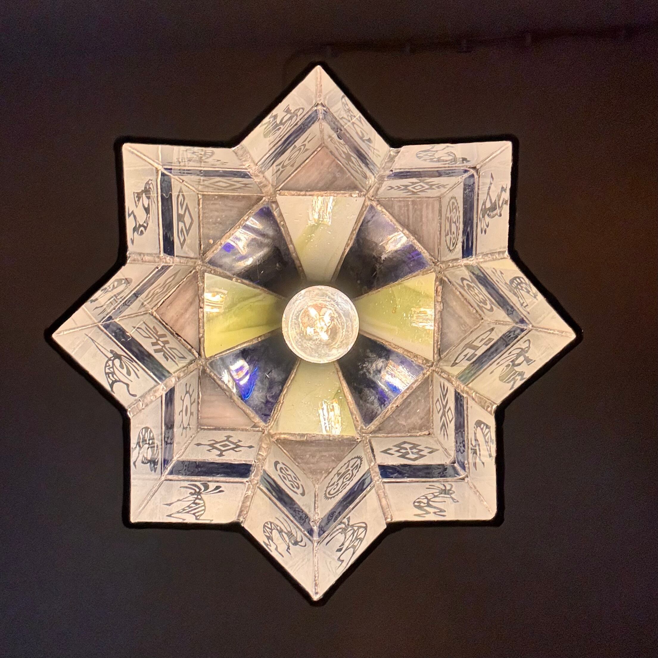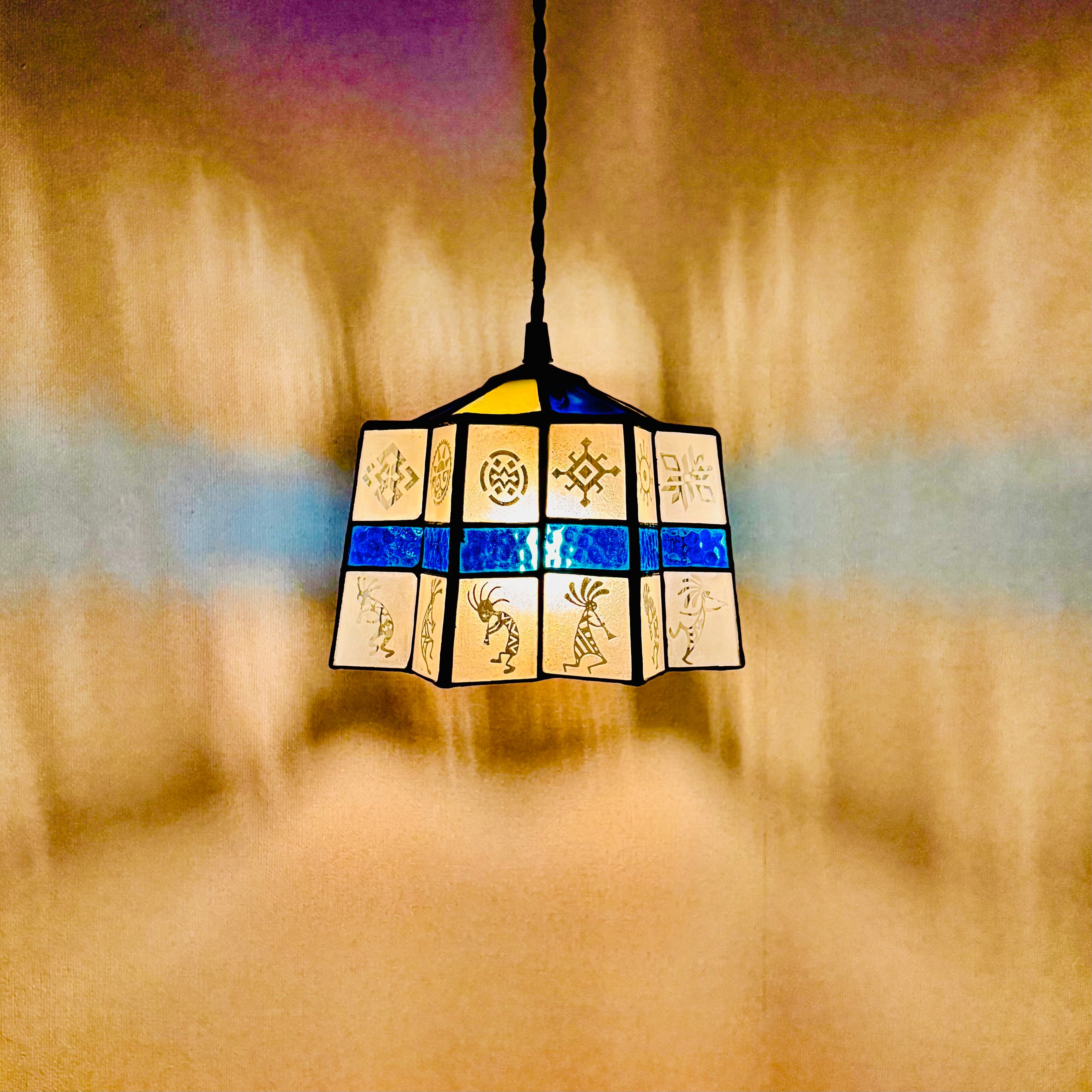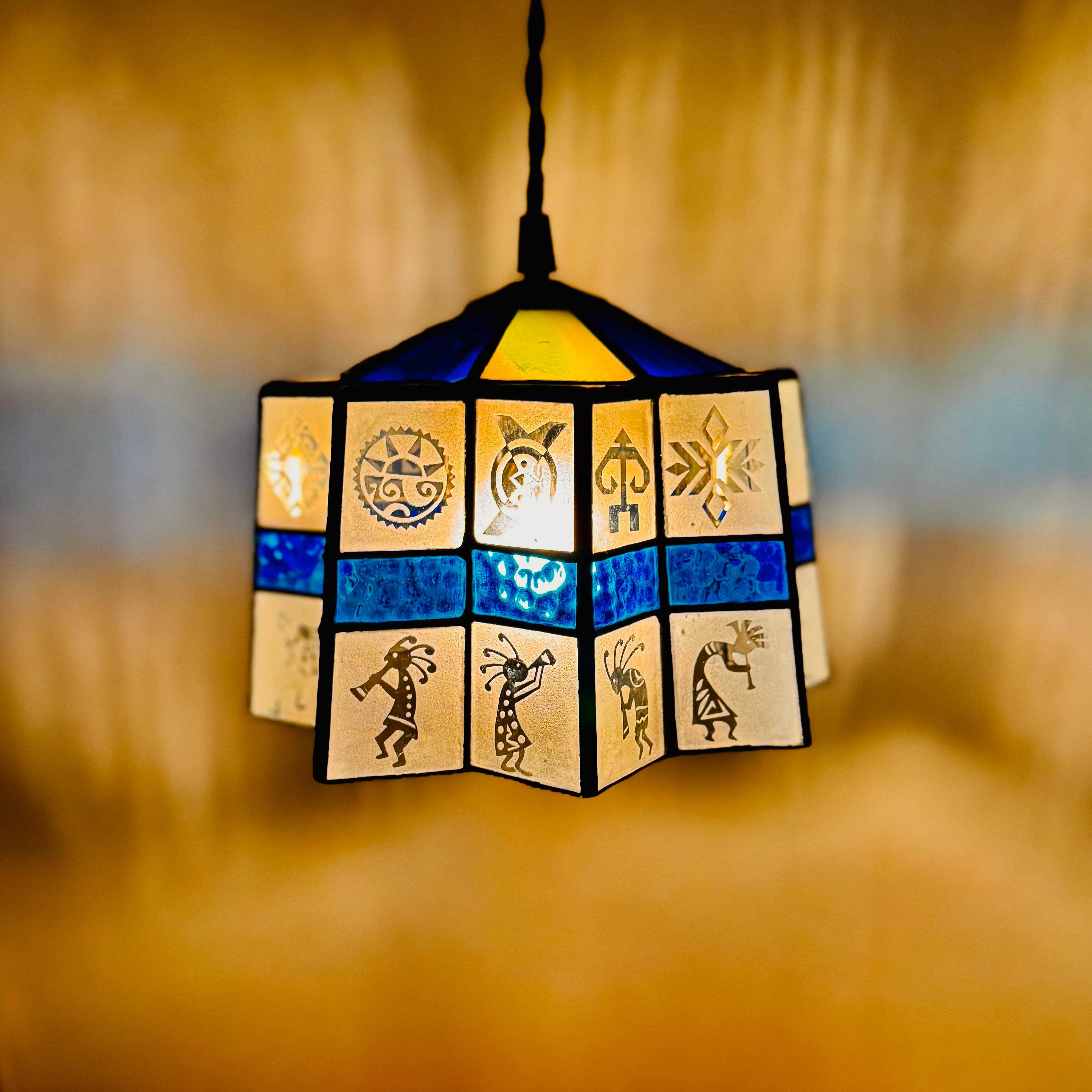 ♌️古代文明の不思議で力の有る模様をサンドブラストで描き、ステンドグラスと組み合わせて、ペンダントライトにしました。