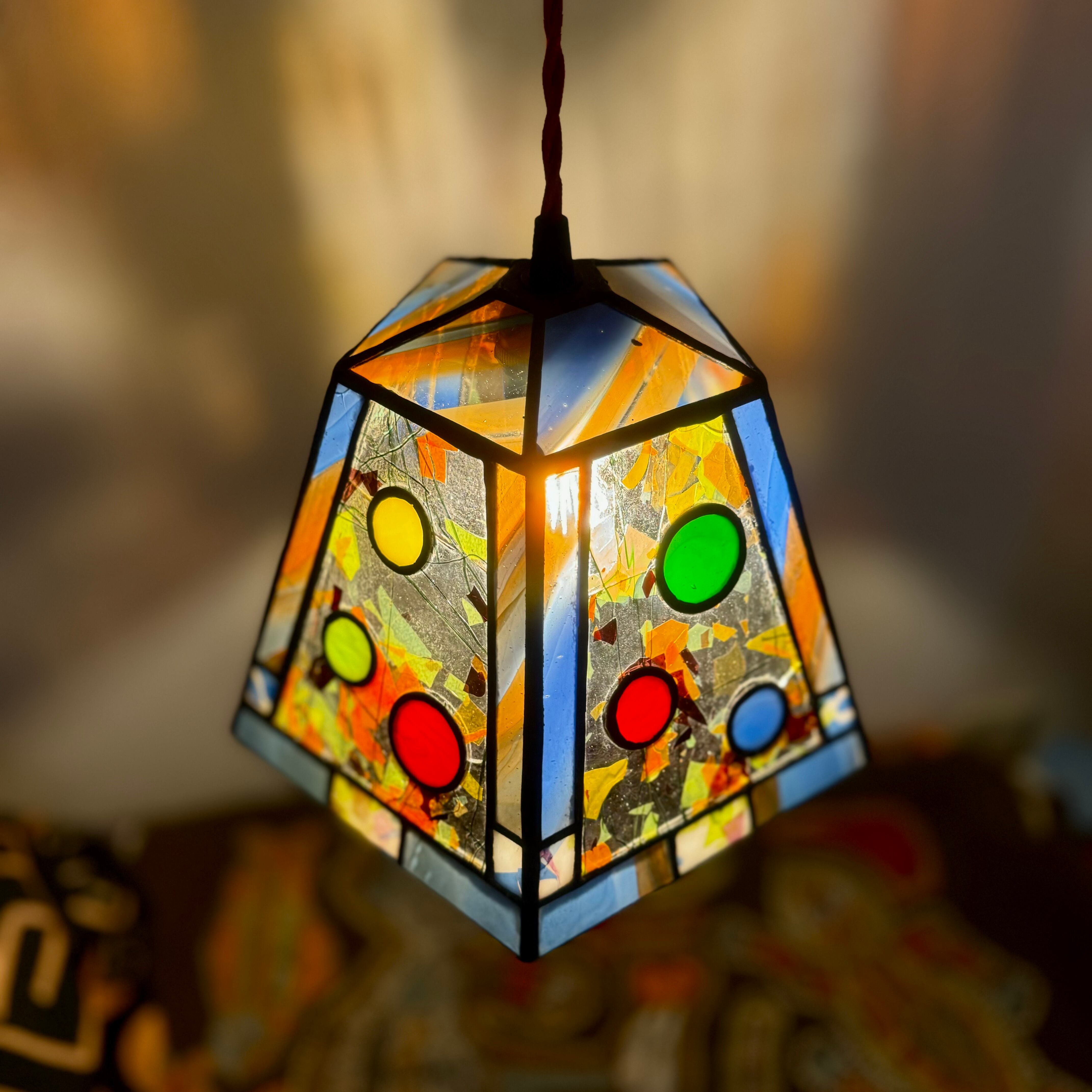 ♦️ 色々な色のガラスを組み合わせ、五角形のランプシェードに仕上げています。