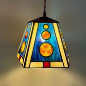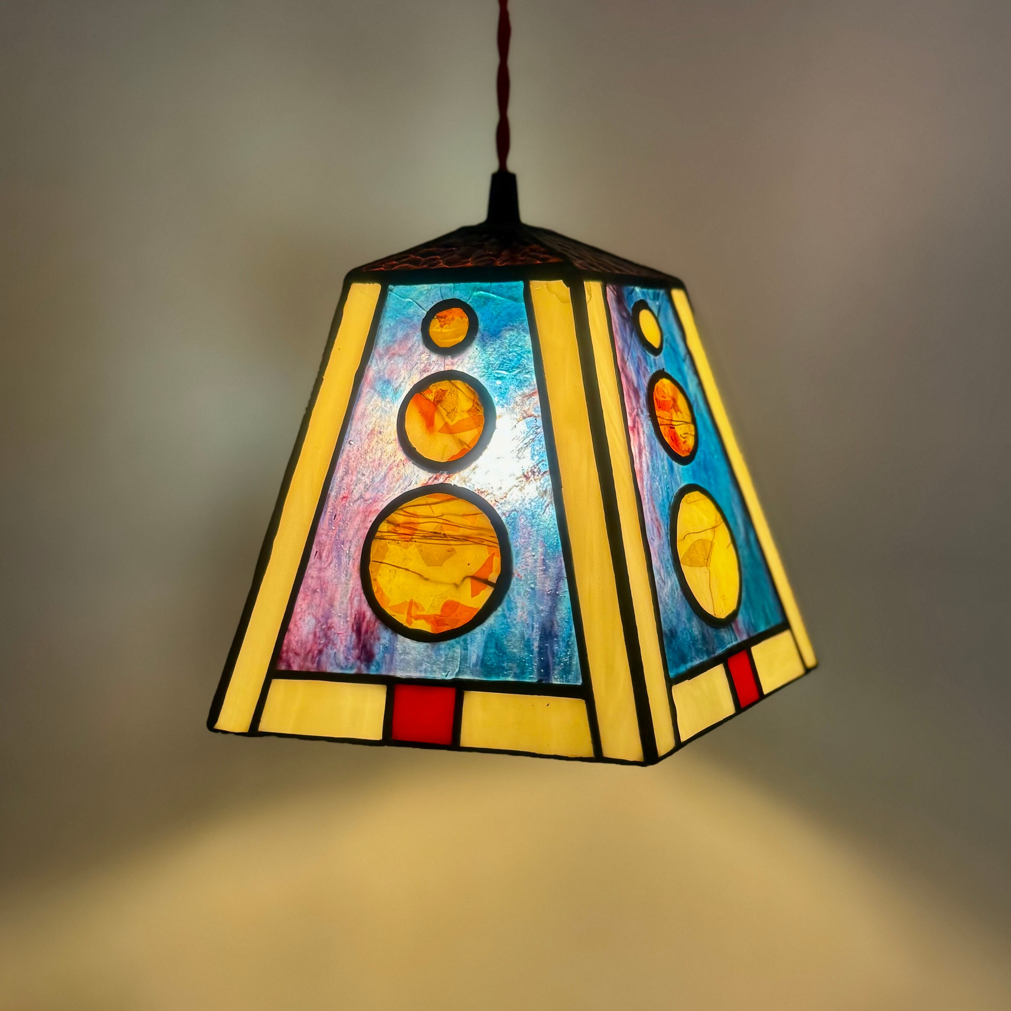 ♦️ 色々な色のガラスを組み合わせ、五角形のランプシェードに仕上げています。