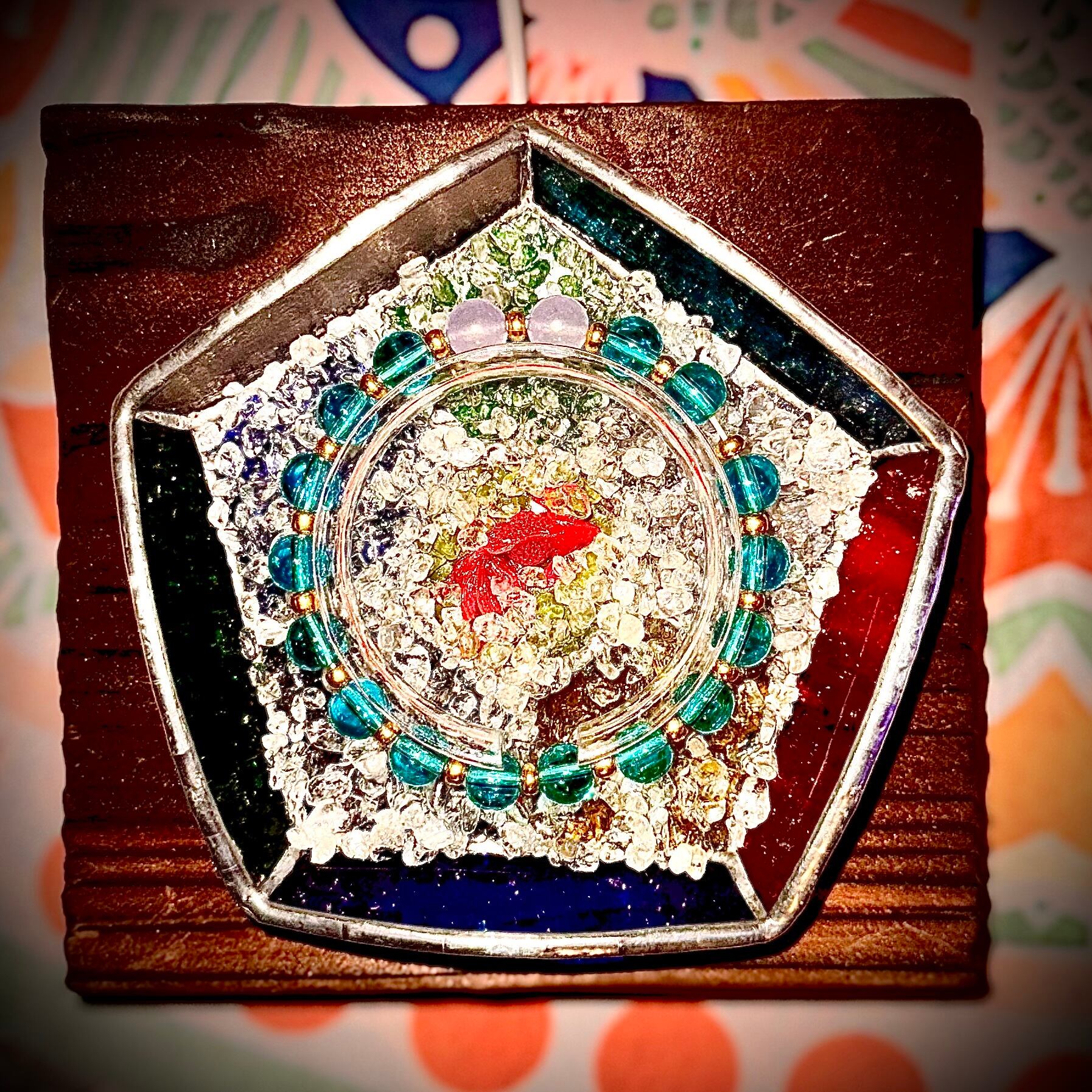 透明ガラスに、色々な色のガラスをレジンで貼り付け、大小さまざまなクリスタルをレジンで固めてました。