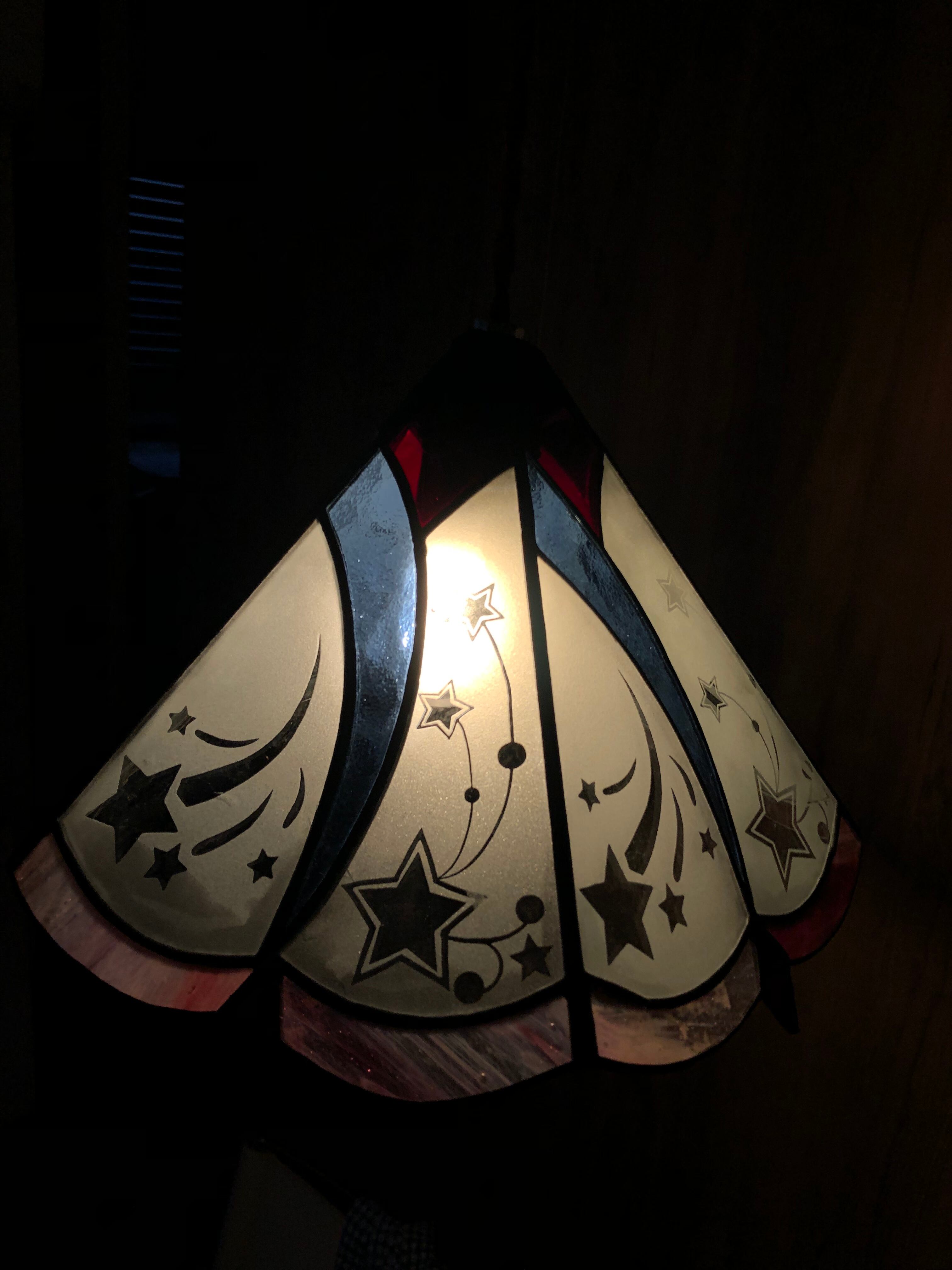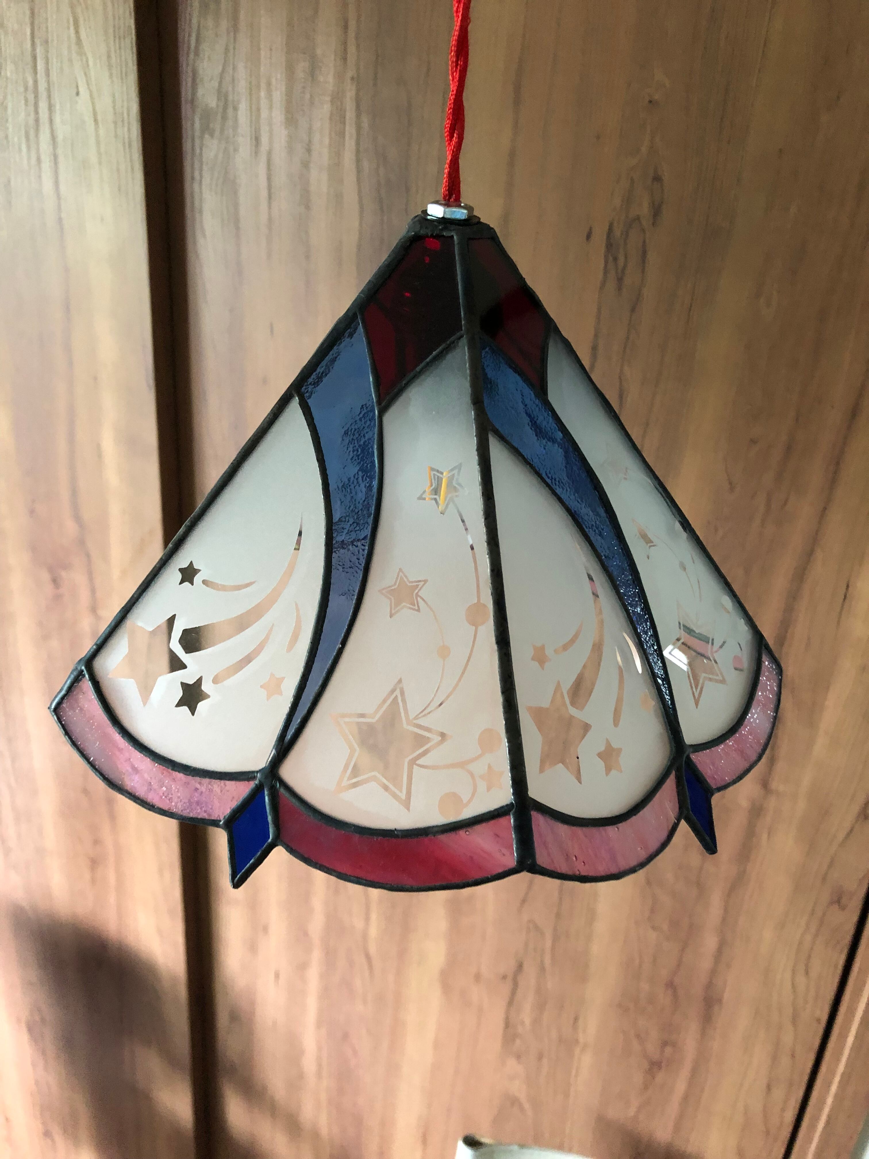 手作りで製作されたステンドグラスのランプシェード。美しくお部屋を彩るアイテム。