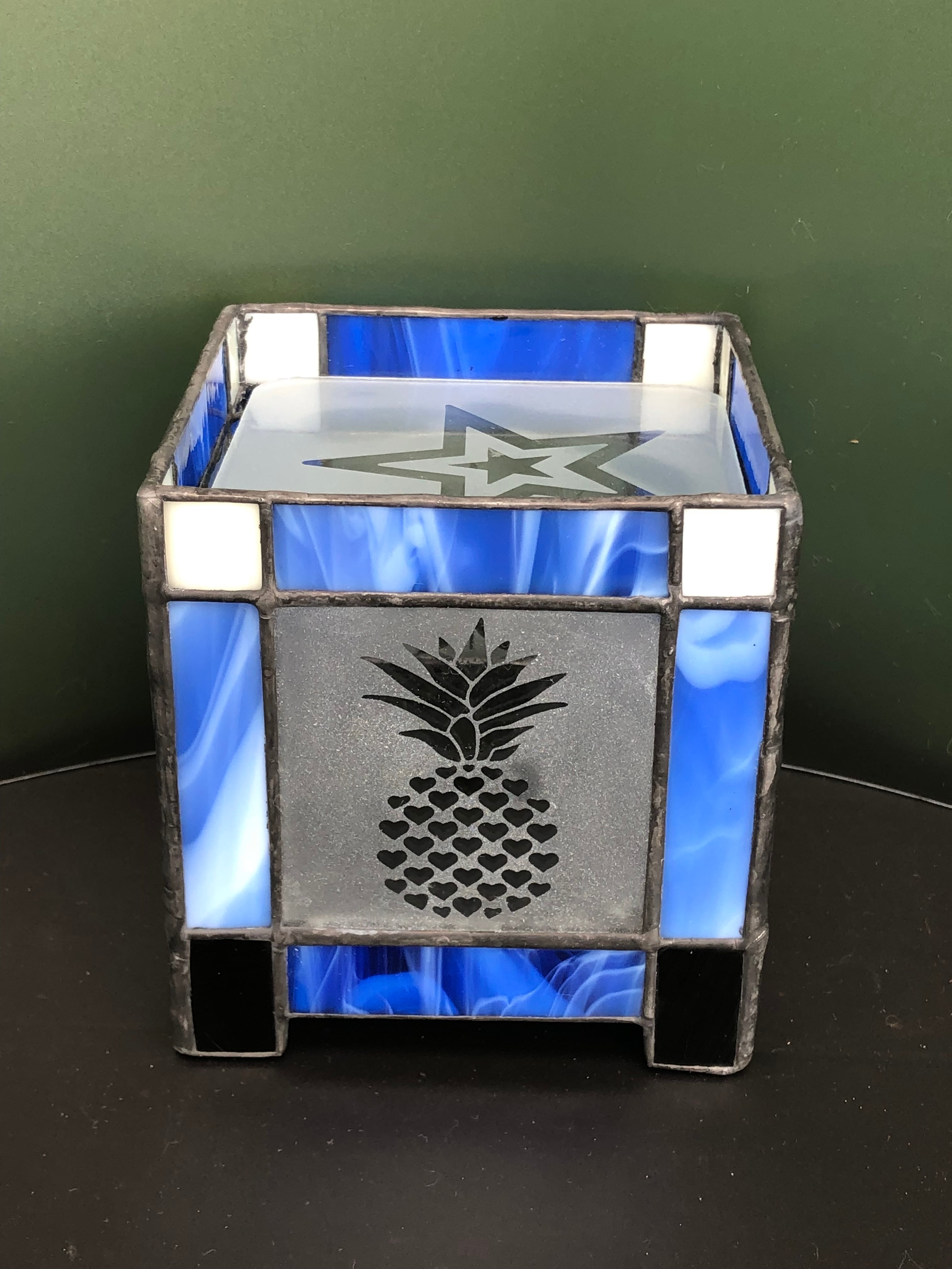 周囲はステンドグラス、各四面には南国バージョンの違う柄を サンドブラストしたガラスで製作してあります。