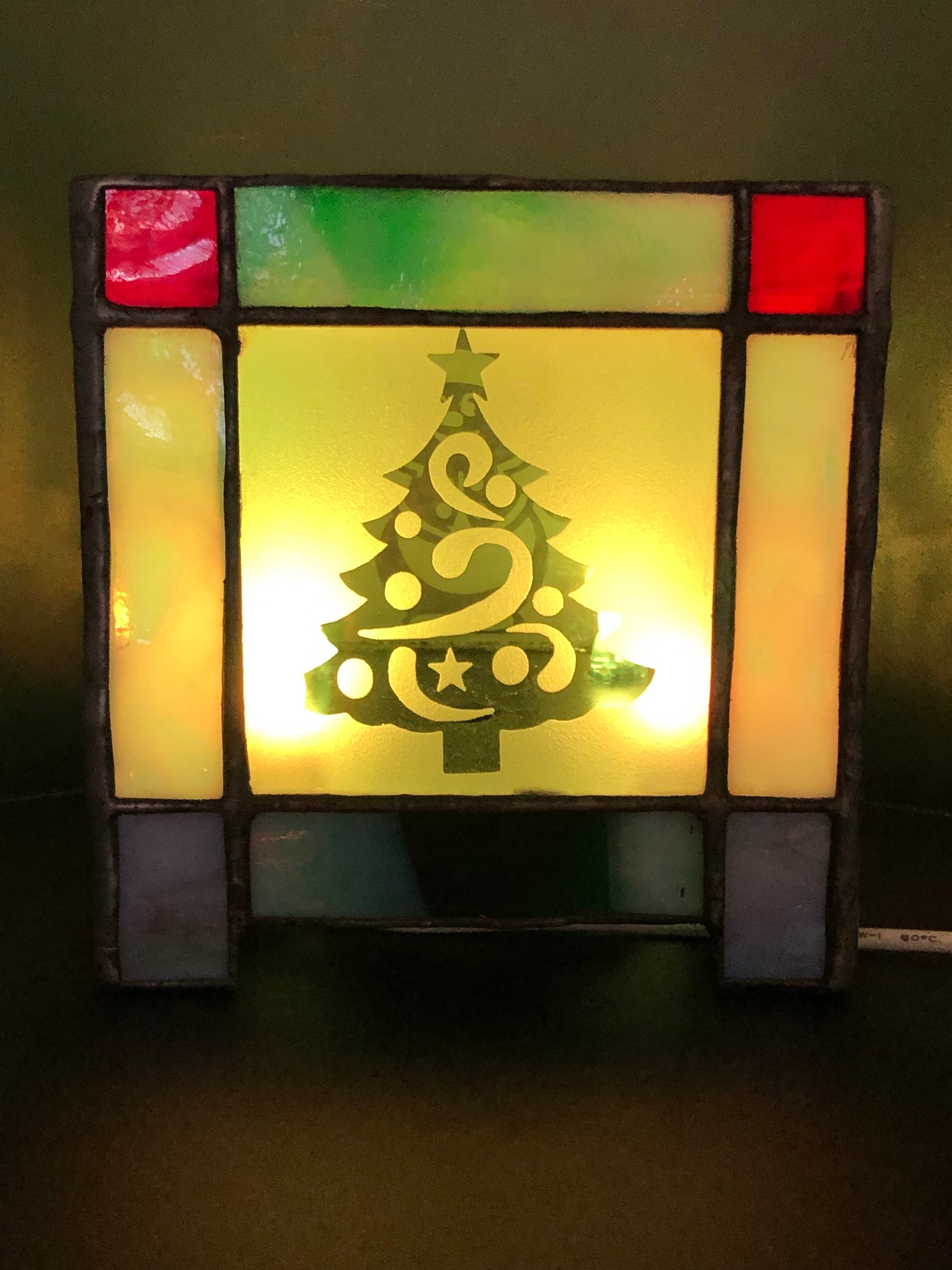 周囲はステンドグラス、各四面にはクリスマスバージョンの違う柄を サンドブラストしたガラスで製作してあります。