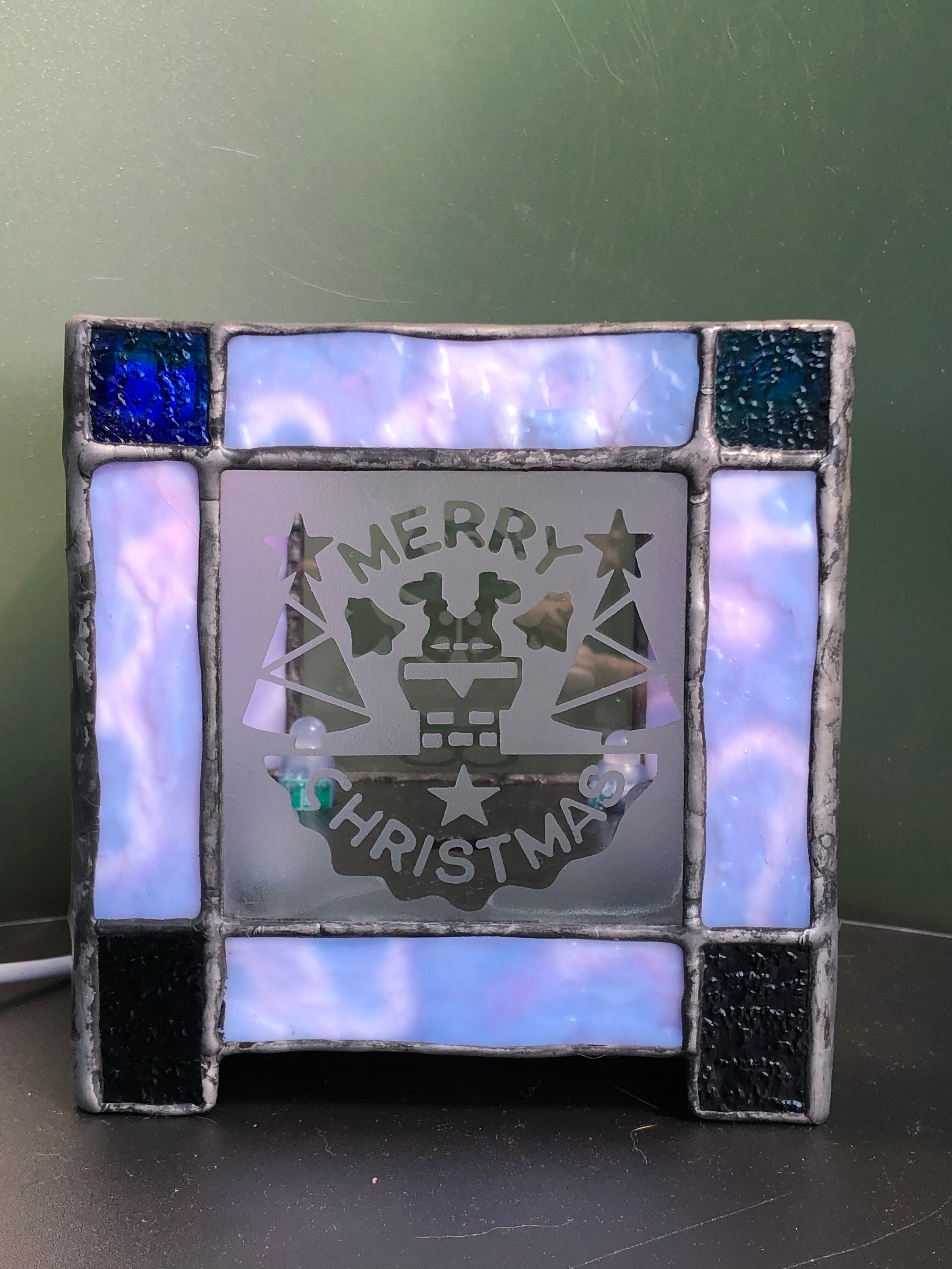 周囲はステンドグラス、各四面にはクリスマスバージョンの違う柄を サンドブラストしたガラスで製作してあります。