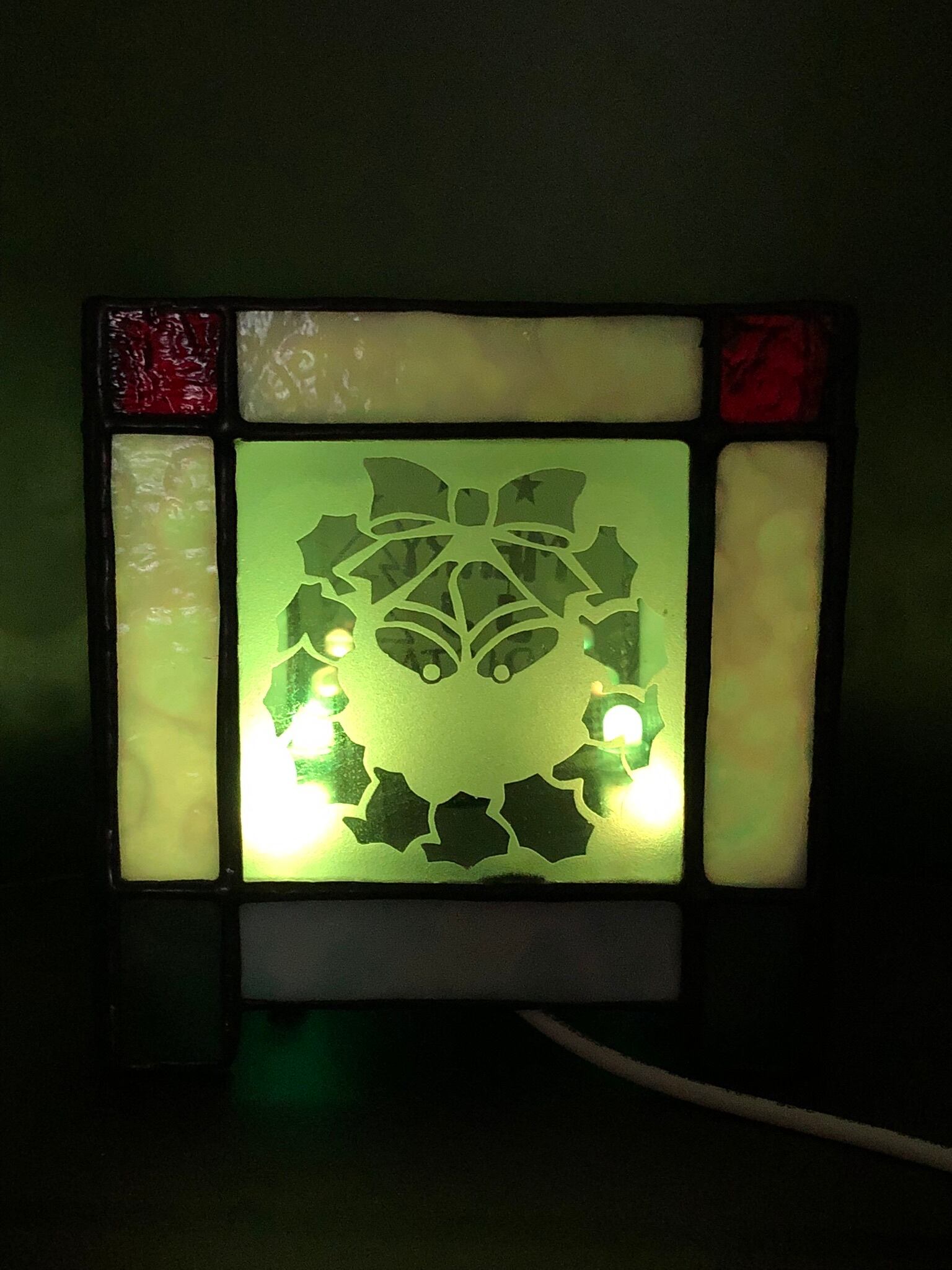 周囲はステンドグラス、各四面にはクリスマスバージョンの違う柄を サンドブラストしたガラスで製作してあります。