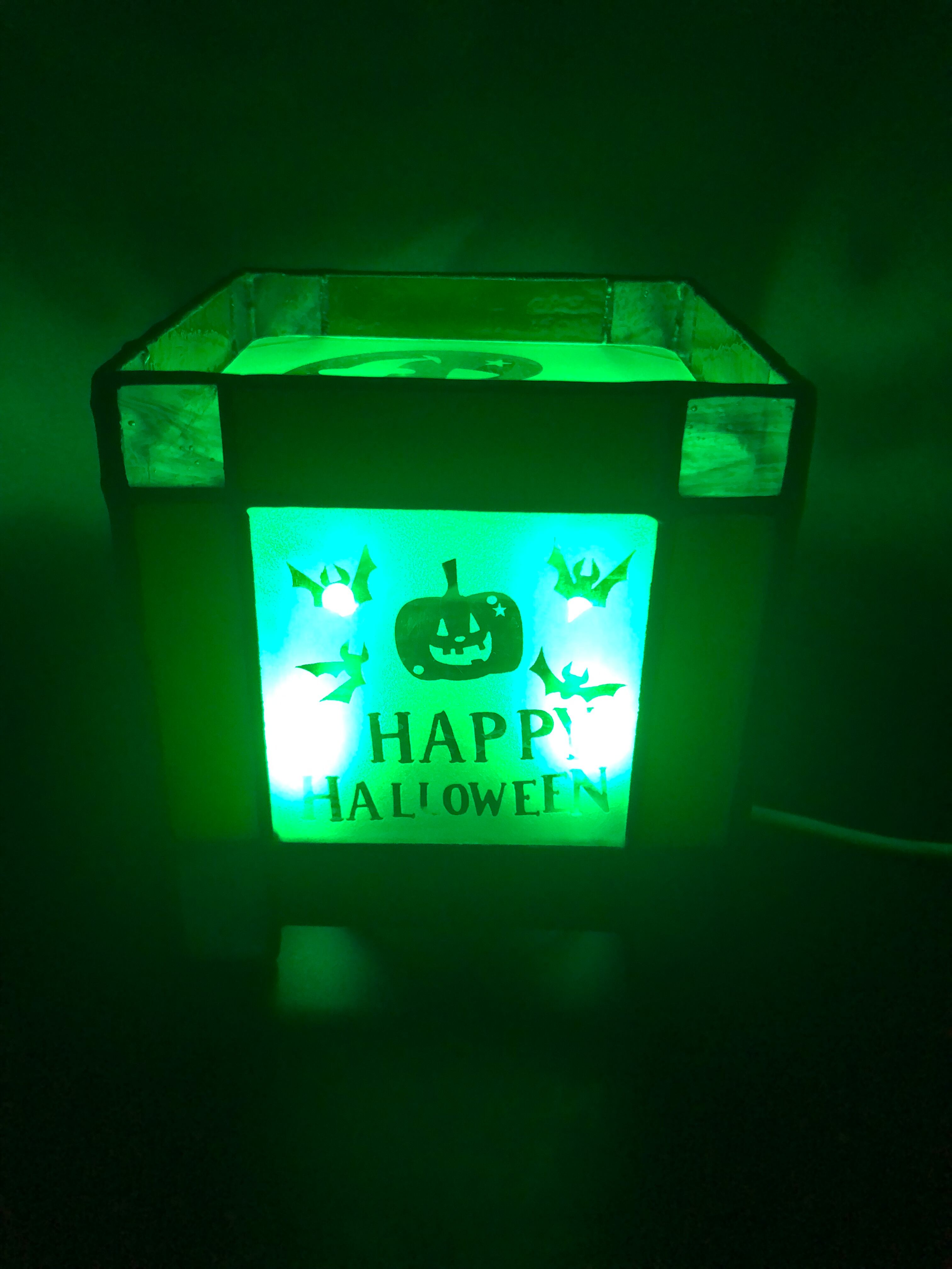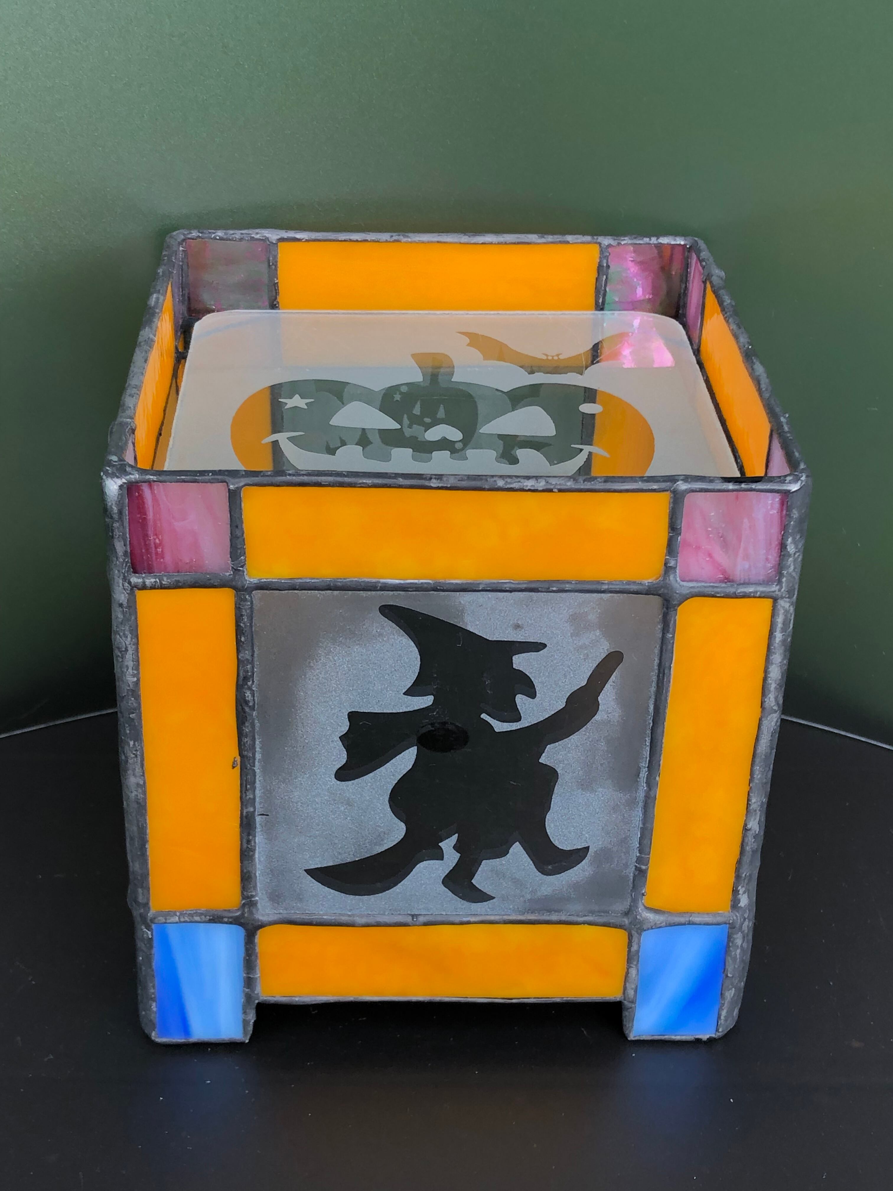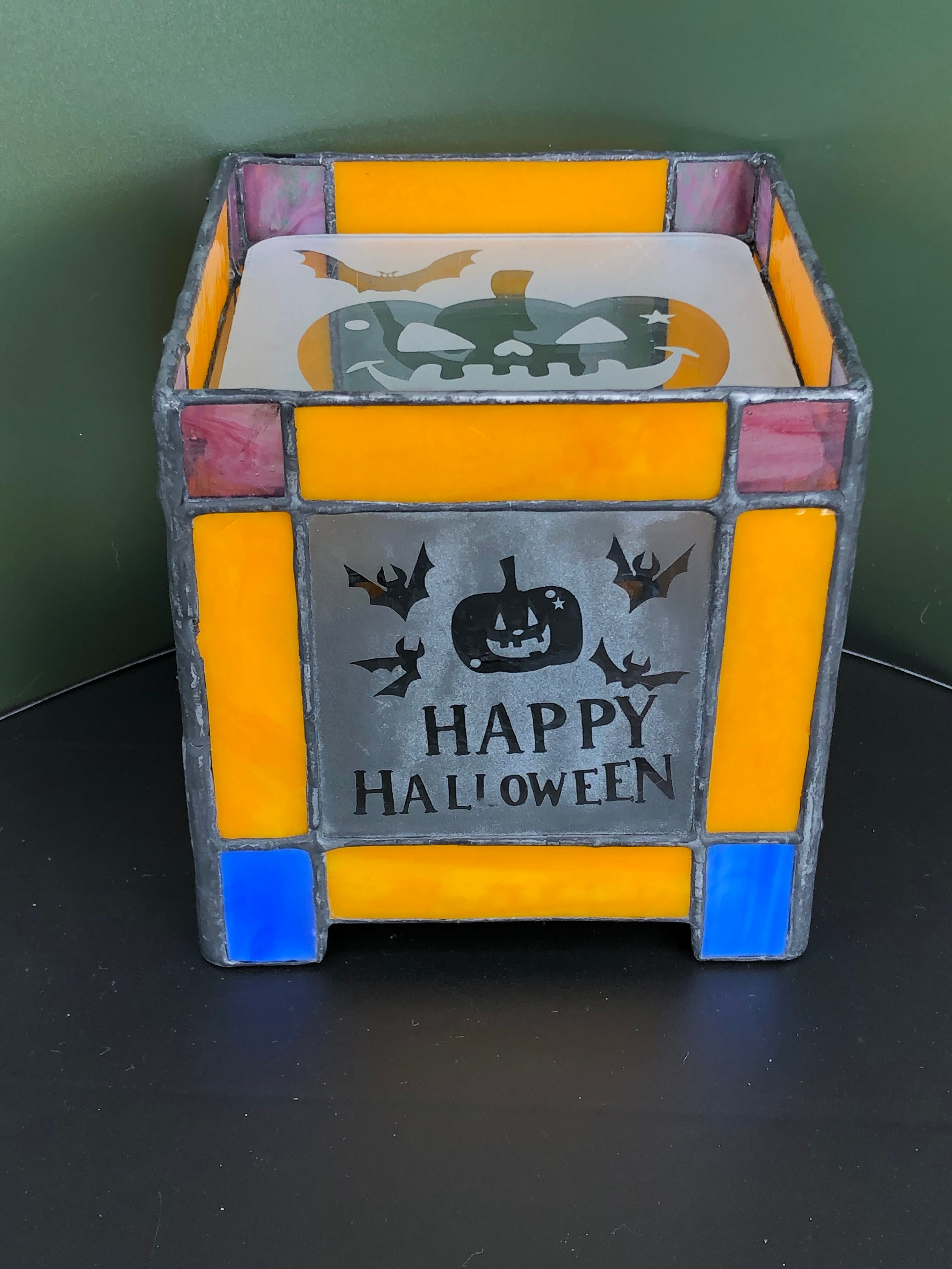 周囲はステンドグラス、各四面にはハロウィンバージョンの違う柄を サンドブラストしたガラスで製作してあります。