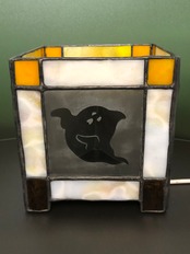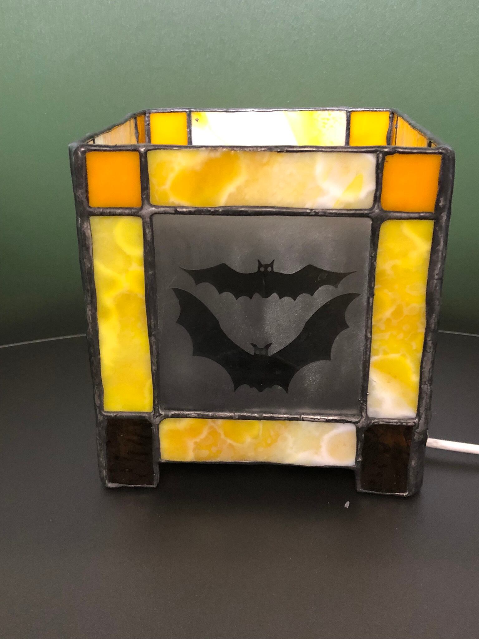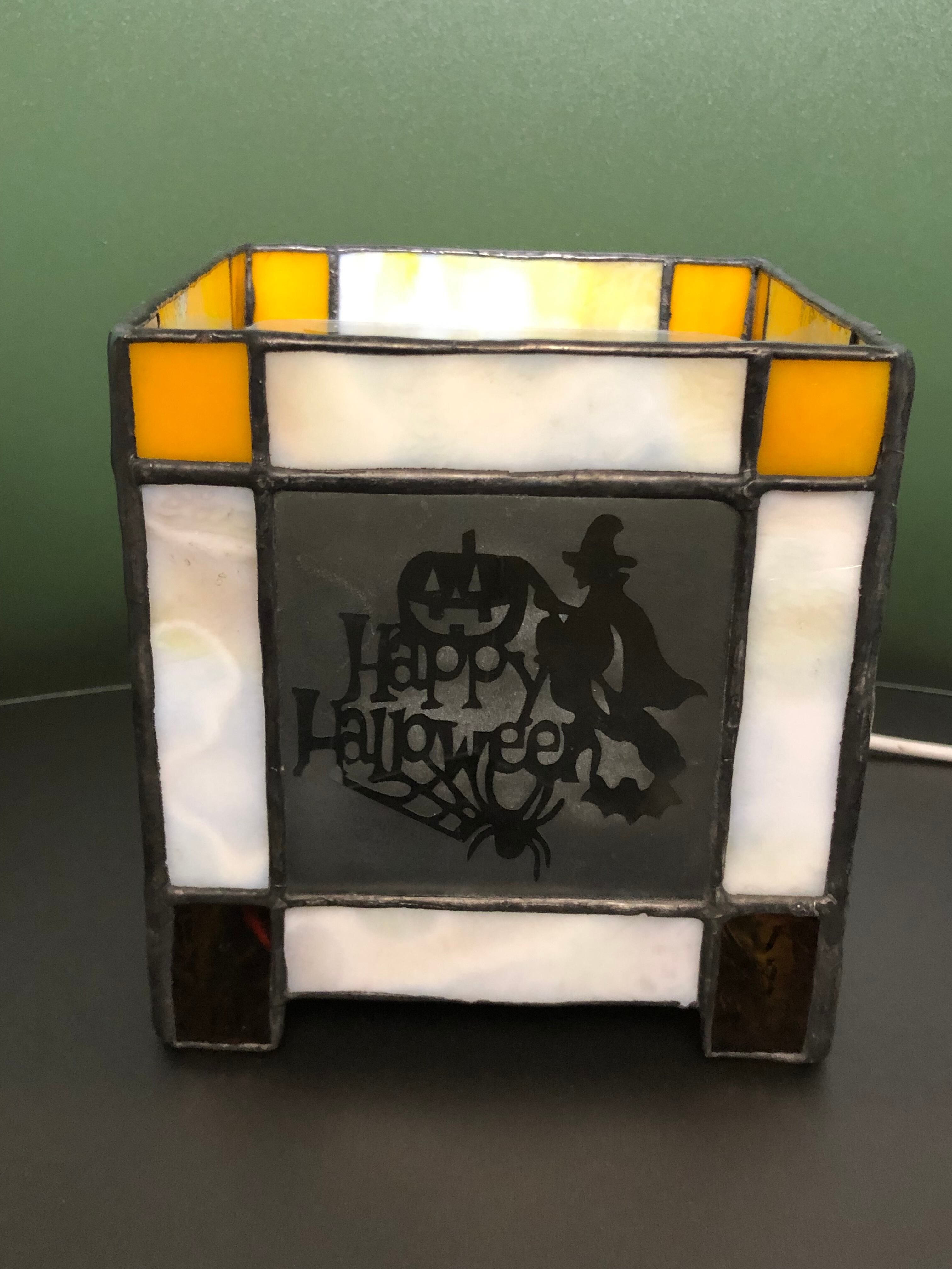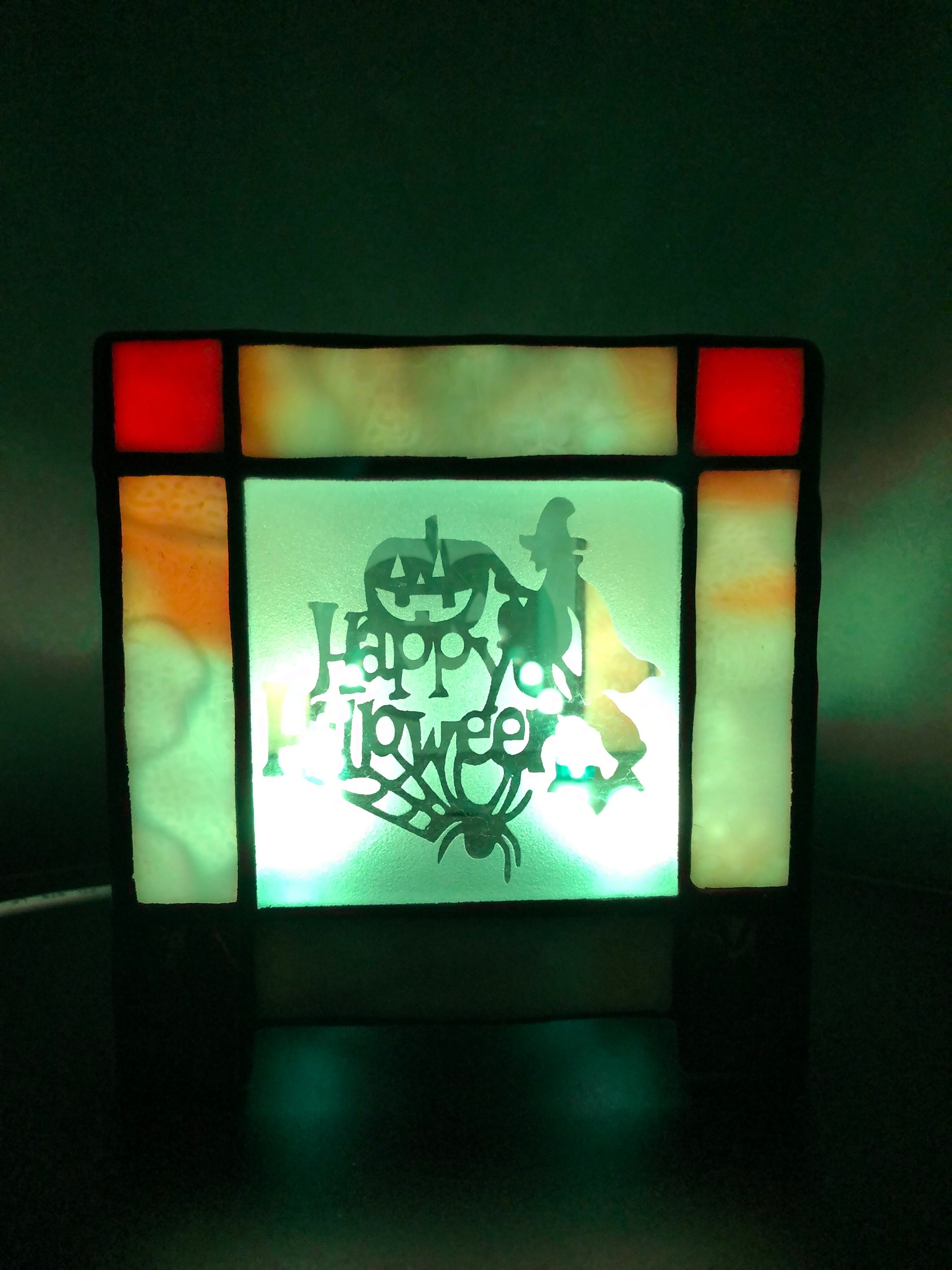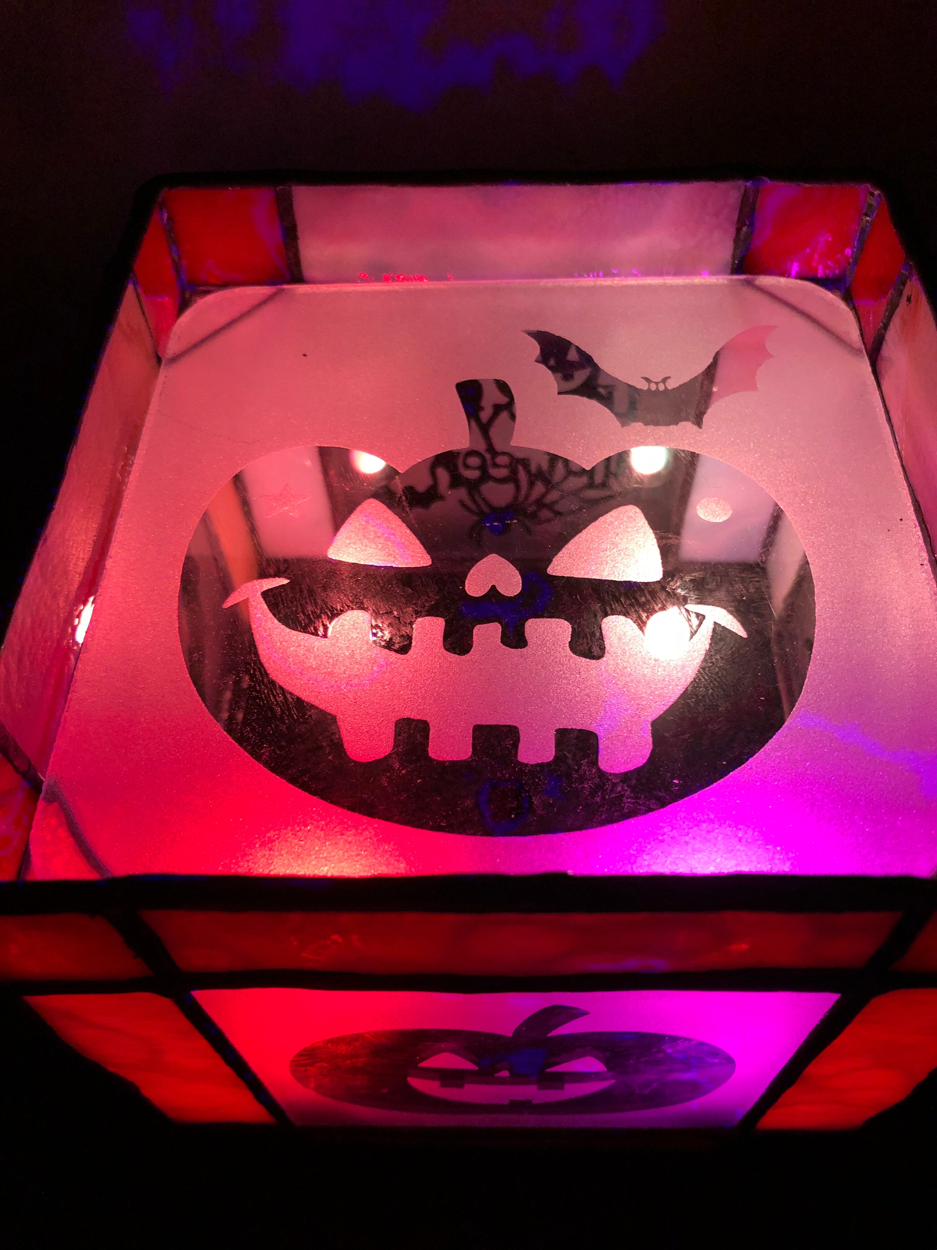 周囲はステンドグラス、各四面にはハロウィンバージョンの違う柄を サンドブラストしたガラスで製作してあります。